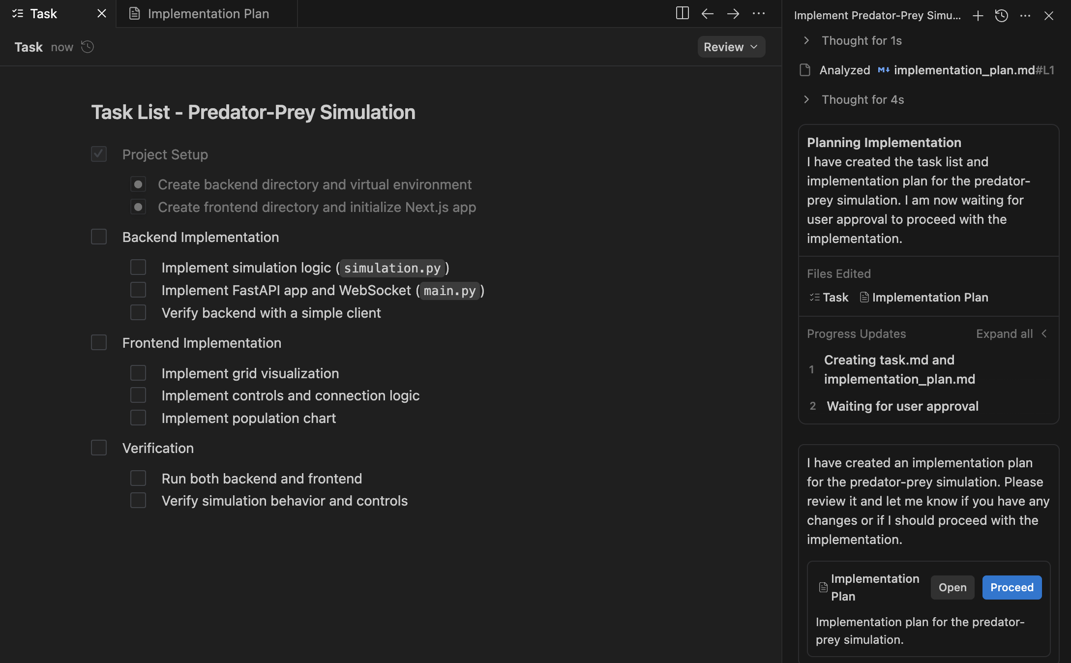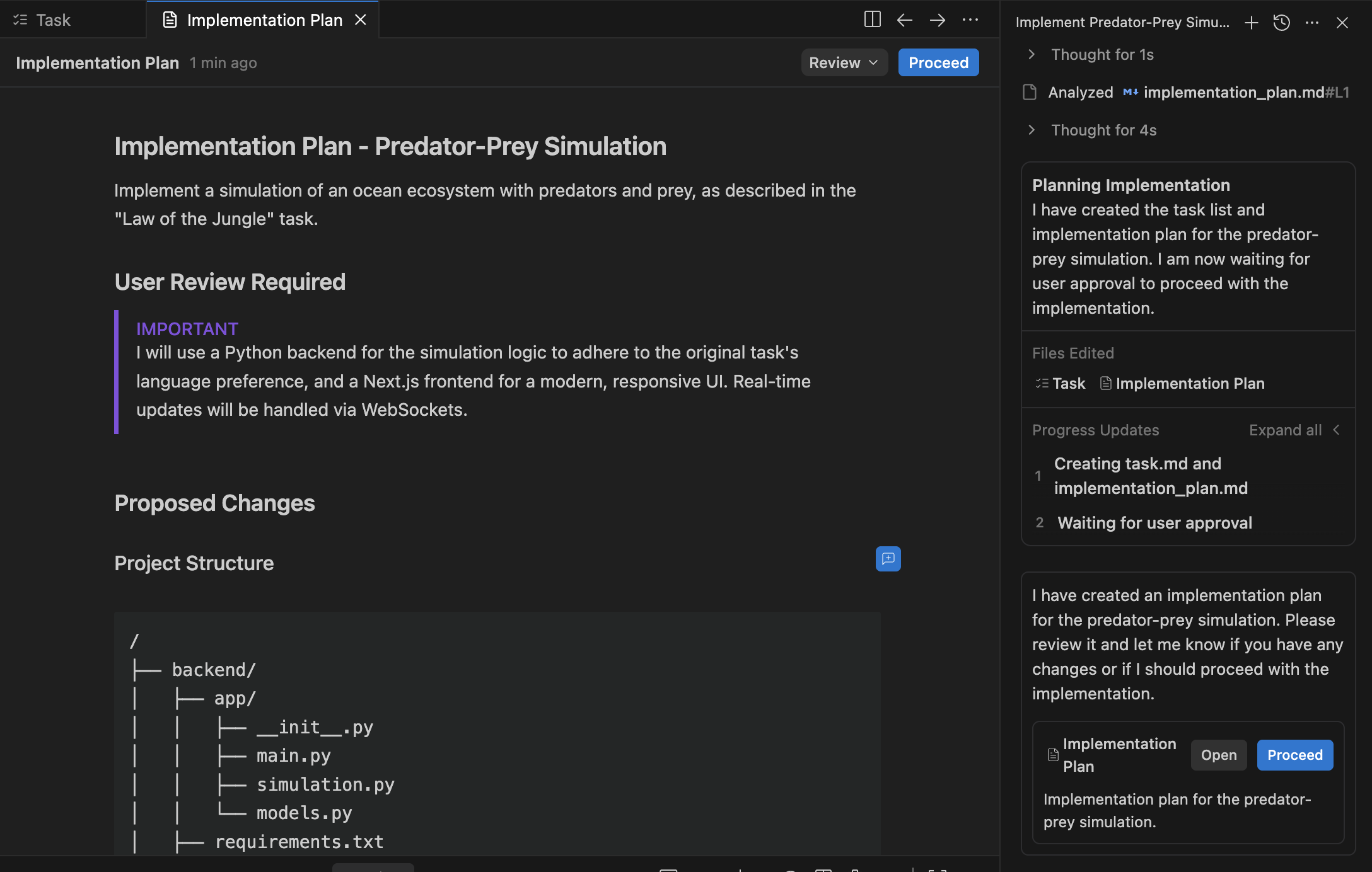 Nice little touches like separate files for Task, Implementation Plan, and Walkthrough; the agents’ thoughts and actions are even more transparent.